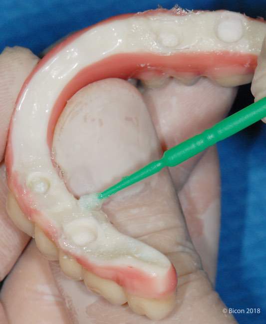 Home/32. Aplicación de vaselina sobre la superficie del borde derecho de la prótesis TRINIA para facilitar la eliminación del cemento de resina sobrante.